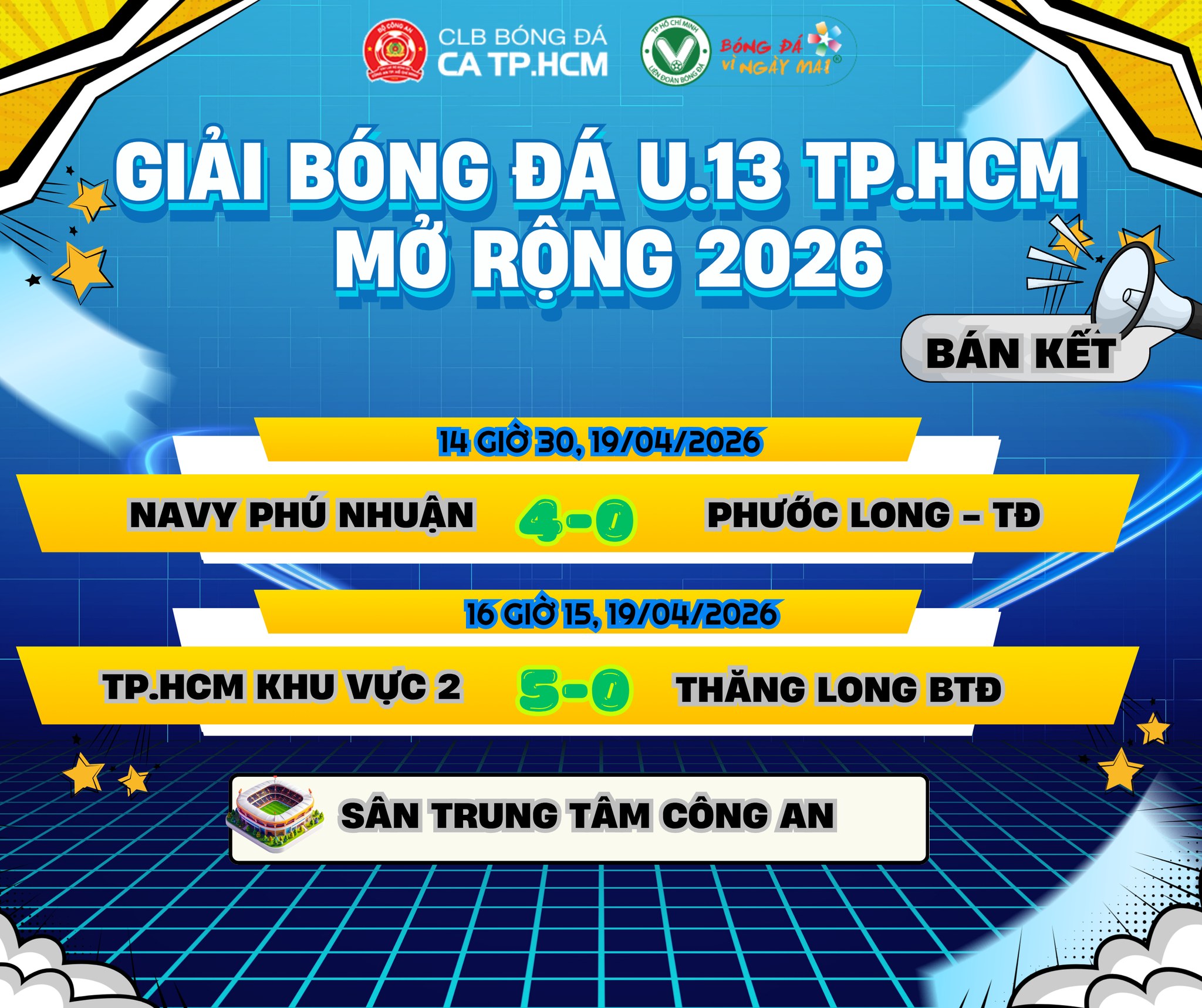 - Lịch thi đấu - kết quả trận chung kết giải bóng đá năng khiếu U13 TP. Hồ Chí Minh mở rộng năm 202606:04 | 22/04/2026