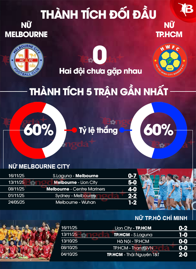 Trận Melbourne City vs CLB TP.HCM ở lượt cuối bảng A giải AFC Women’s Champions League 2025/26 diễn ra lúc 19h00 ngày 19/11. Bongdaplus phân tích thông tin lực lượng, đội hình dự kiến, dự đoán tỉ số.