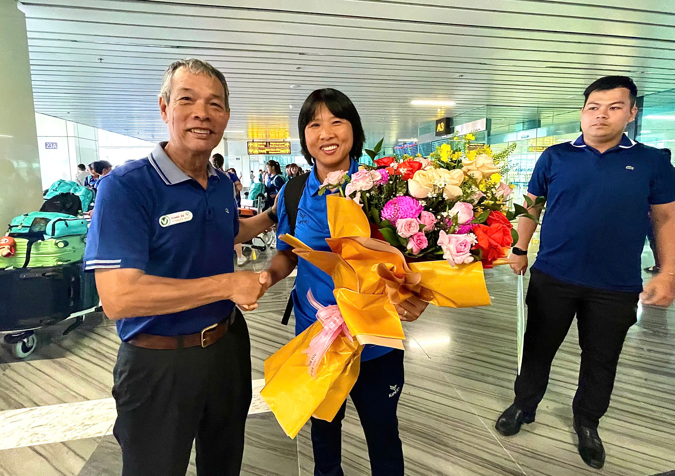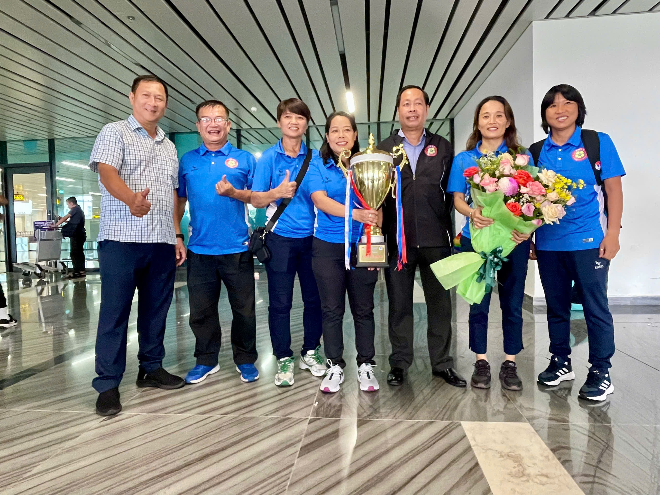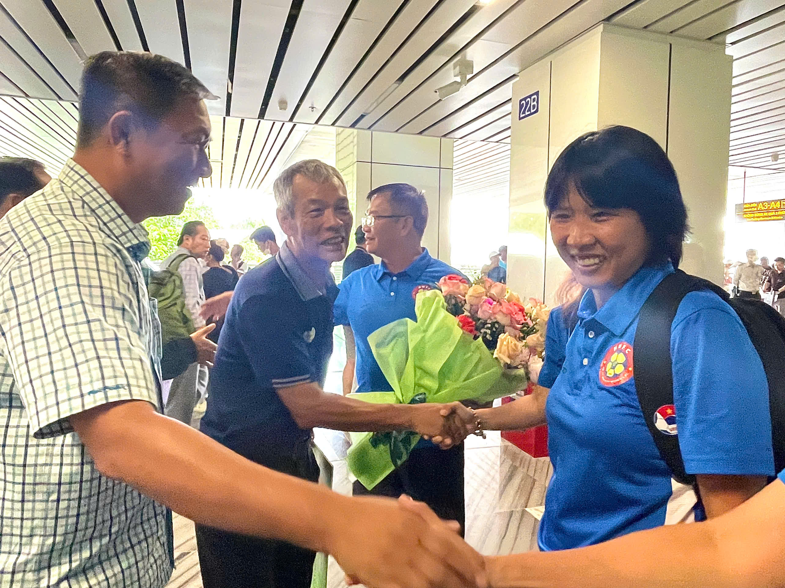 Trực tiếp có mặt tại sân bay Tân Sơn Nhất để đón cô trò HLV Đoàn Thị Kim Chi có ông Ngô Lê Bằng – Phó Chủ tịch Liên đoàn Bóng đá TP. Hồ Chí Minh (HFF); ông Hoàng Ngọc Tuấn – Phó TTK HFF; ông Nguyễn Hữu Thành – Giám đốc Trung tâm TDTT Thống Nhất.