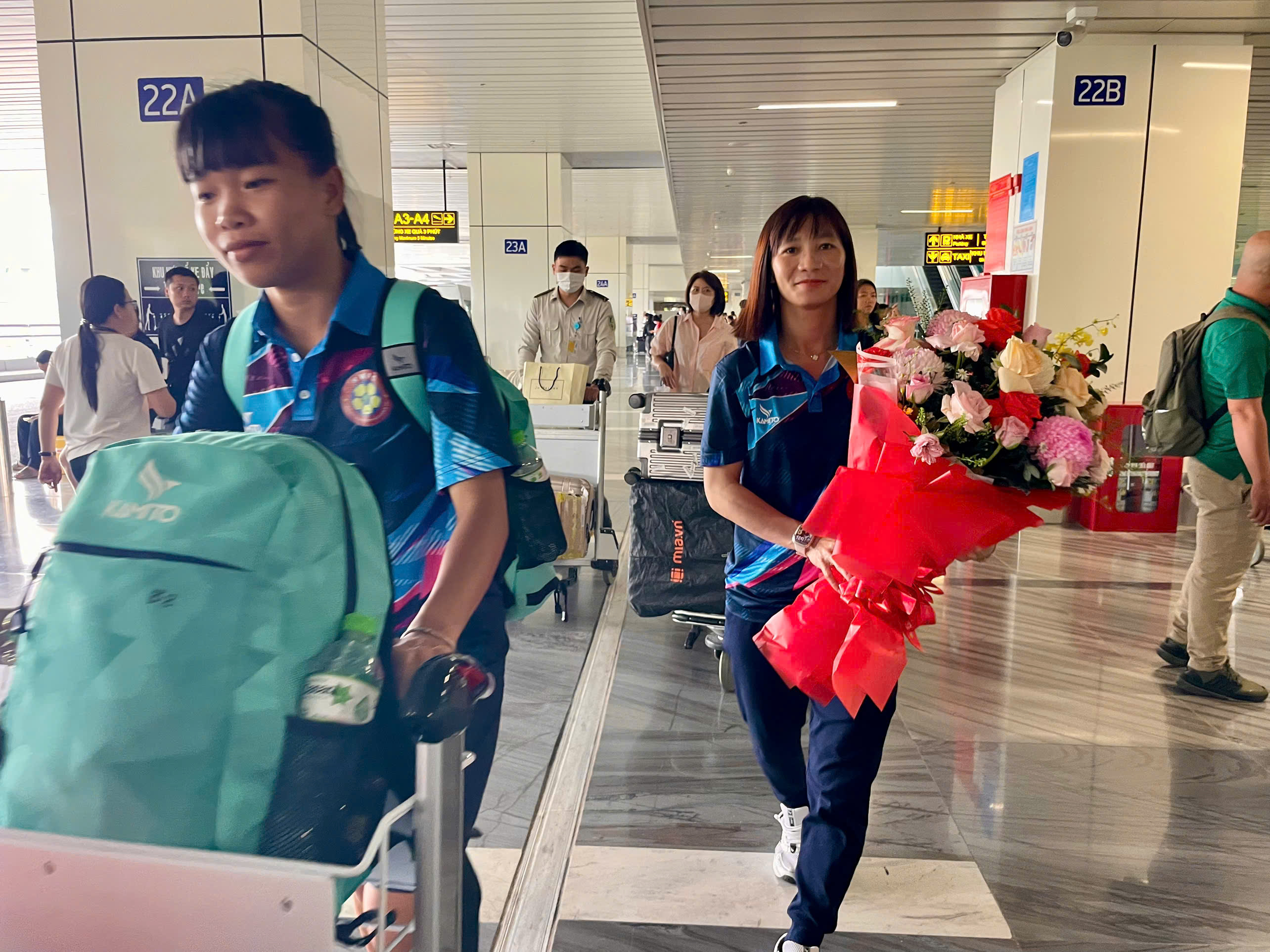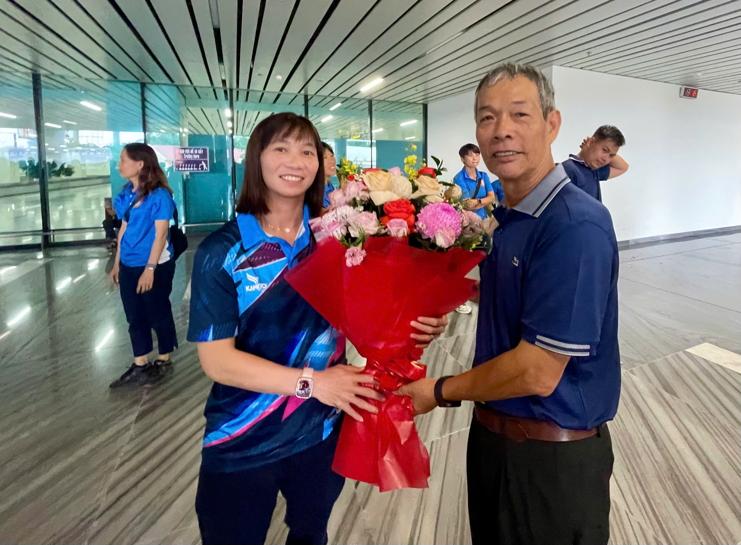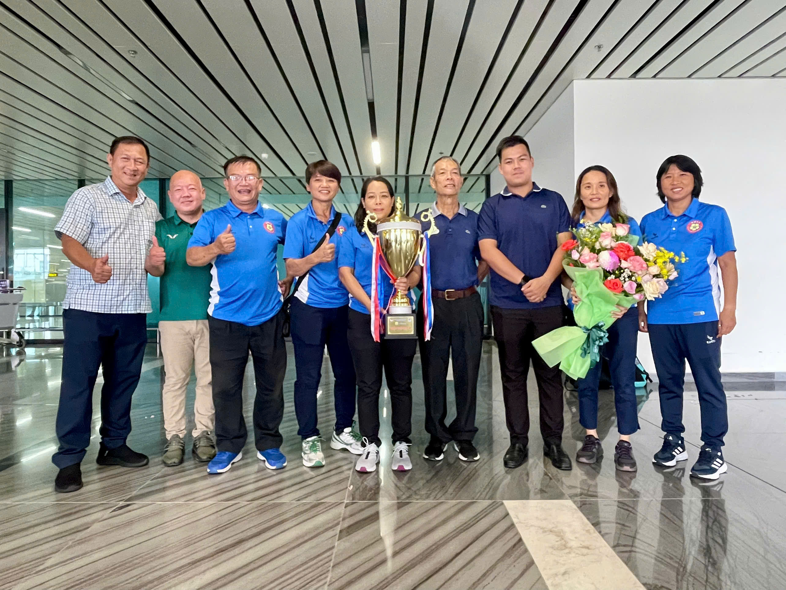 Trực tiếp có mặt tại sân bay Tân Sơn Nhất để đón cô trò HLV Đoàn Thị Kim Chi có ông Ngô Lê Bằng – Phó Chủ tịch Liên đoàn Bóng đá TP. Hồ Chí Minh (HFF); ông Hoàng Ngọc Tuấn – Phó TTK HFF; ông Nguyễn Hữu Thành – Giám đốc Trung tâm TDTT Thống Nhất.